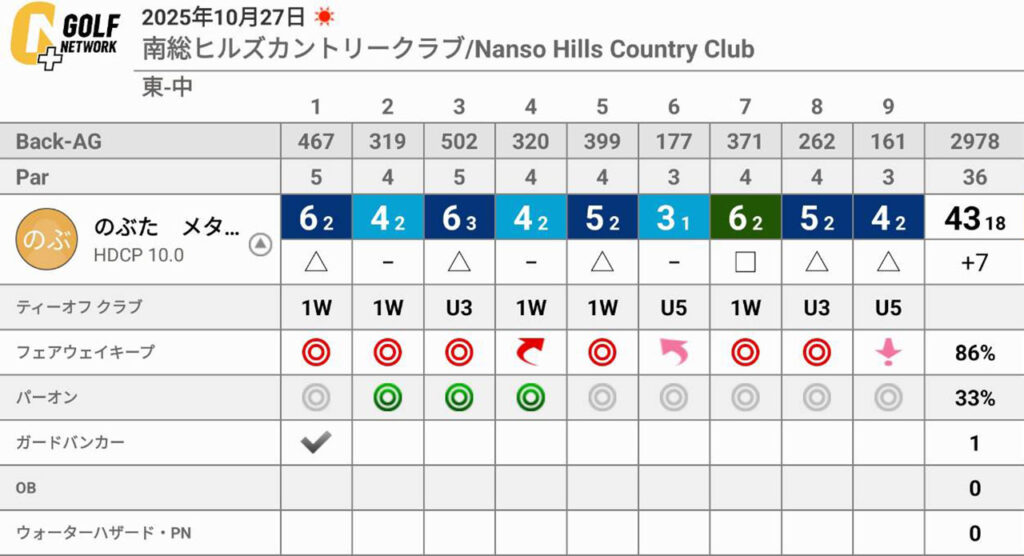 後半は、2番ホールのショートでナイスショットが結果に繋がらなかったこともあり、メンタル的にやられてしまって続くホールの連続OBに繋がってしまいました。その後は集中力も持続できないことになり50の大たたき。