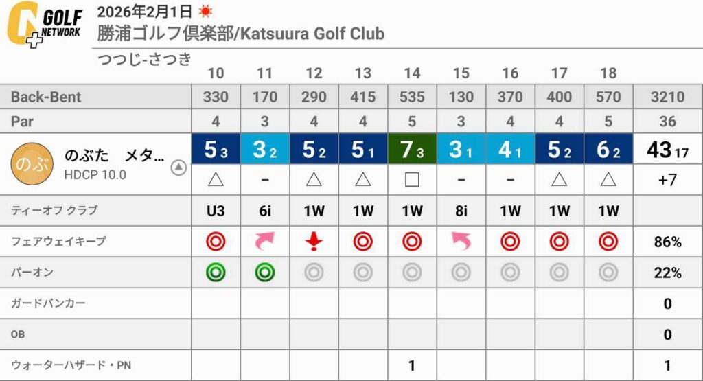 後半に入って、やっとショットがある程度まとまってきたので、スコアを作ることができました。前半の1OB3ワンペナという結果ではスコアにならないのは言うまでもなく、反省点の多いラウンドでした。